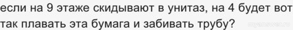 Заехала в кв. Хозяин сказал НЕ сливать в унитаз бумагу, все ок, как послушный съемщик этого не делаю. И вот второй день замечаю как в унитазе начала плавать туалетная бумага. Возникли такие вопросы. По всему дому получается одна труба эта, и если на 9 этаже скидывают в унитаз, на 4 будет вот так плавать эта бумага и забивать трубу? Или скидывают тогда уже точно на 5-6 этаже?