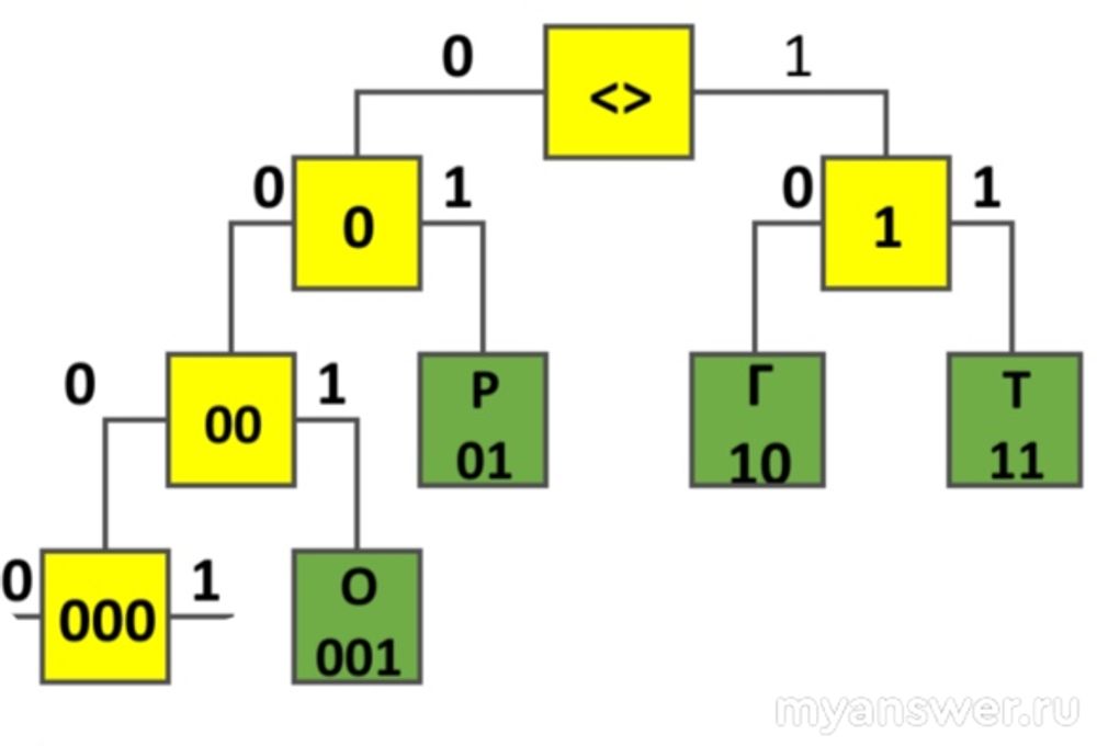 Для букв Г, Р, О, Т использовали соответственно кодовые слова 10, 01, 001, 11.