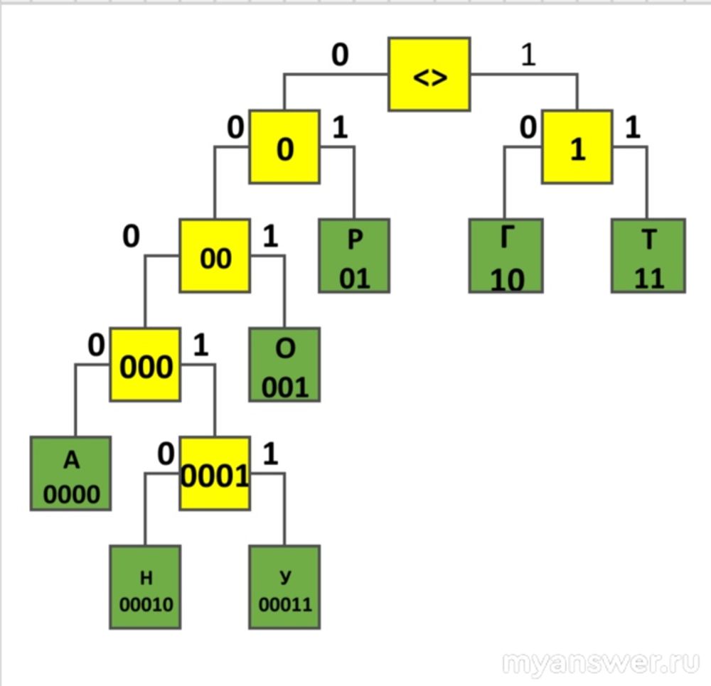 Для кодирования некоторой последовательности, состоящей из букв А, Г, Н, О, Р, Т, У решили использовать неравномерный двоичный код, гарантирующий однозначное декодирование.