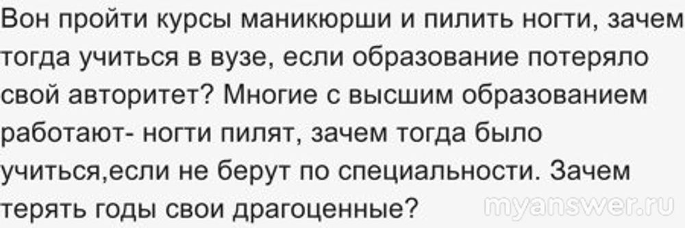 Так что собирать примеры про людей с высшим образованием, которые работают маникюршами - это уже старО. Это было актуально после 90-х, когда очень многие получили в/о, которое никуда не применить. А сегодня такого стало намного меньше. В/о снова открывает привлекательные двери к интересным занятиям. И, конечно, ни о каком в/о без хорошей учебы в школе нечего и мечтать.