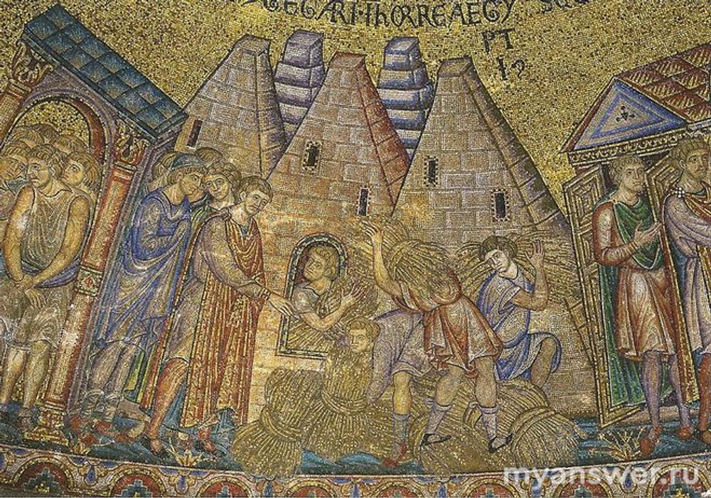 В средние века пирамиды стали связывать с библейским персонажем Иосифом (тем самым, которого братья продали в египетское рабство). Нас интересует тот момент его биографии, когда Иосиф сумел растолковать фараону сон о тучных и тощих коровах, за что был поставлен управлять провиантом всей страны. Управление это заключалось главным образом в собирании провизии долгого хранения и её охране, отчего данный библейский персонаж в изобразительном искусстве часто ассоциируется... со складскими помещениями. Забыв истинное назначение царских захоронений, их веками считали зернохранилищами Иосифа и даже изображали, используя своё воображение и знания по геометрии. Например, так они выглядят на мозаике собора Св. Марка в Венеции. Как художнику объяснили, так он и изобразил. На дворе стоял 1275 год, до начала научного изучения истории Египта оставалось каких-то полтысячелетия с хвостиком.