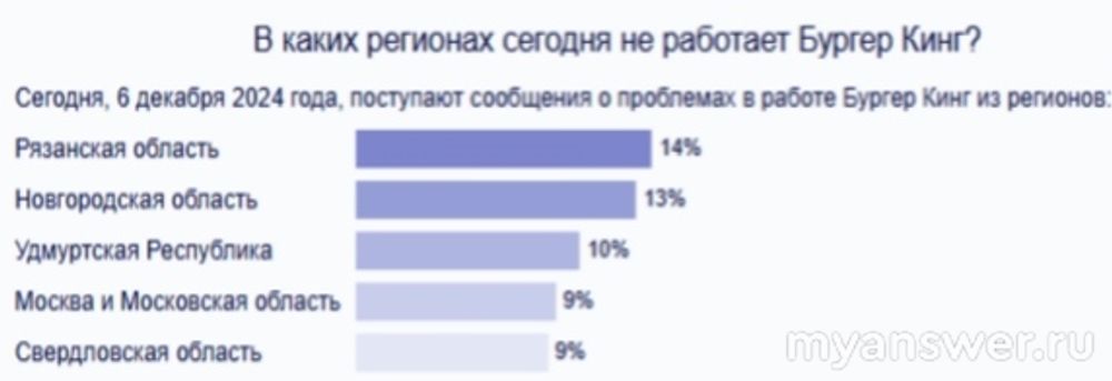 В Рязанской, Свердловской, в Московской, Новгородской областях, Москве, Удмуртской Республике наблюдается сбой в работе Бургер Кинг, и порядка 70% в статистике сбоев приходится на мобильное приложение, 5% - сбой личного кабинета, 23% - сбой сайта.