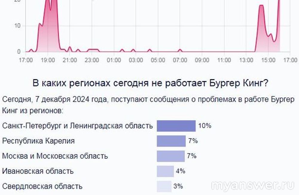 Думаю, что сейчас все знают, что Бургер Кинг является сетью быстрого питания. У них еще имеется сайт и мобильное приложение. С их помощью можно заказать готовые блюда, и их привезут, куда скажете. Шестого декабря данный сервис перестал корректно работать. Люди не могут загрузить сайт и мобильное приложение открыть. В связи с чем начались жалобы. Пик их пришелся девятнадцать часов по Москве, когда сразу двадцать четыре человека пожаловались. География подобных жалоб от Москвы до Свердловской области. Выглядит таким образом: