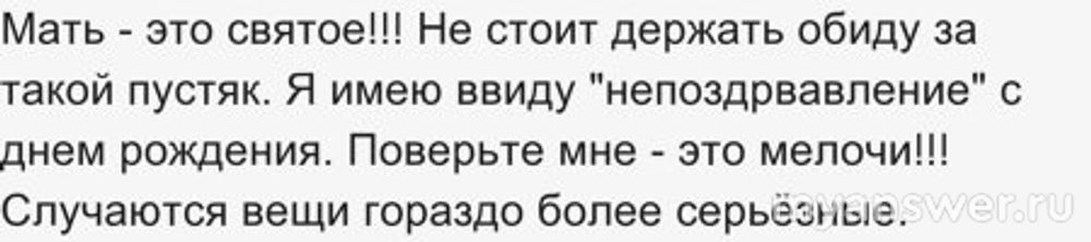 Мать - это святое!!! Не стоит держать обиду за такой пустяк. Я имею ввиду "непоздрвавление" с днем рождения. Поверьте мне - это мелочи!!! Случаются вещи гораздо более серьёзные. И, тем не менее, люди находят общие точки соприкосновения. Но это уже совсем другая история...