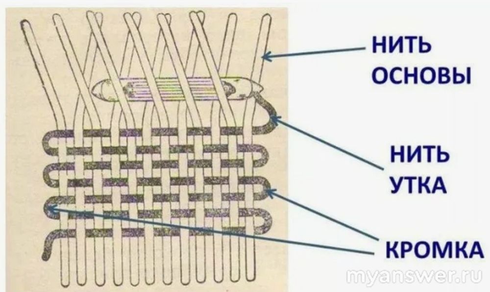 На ткацкой фабрике вначале на большой вал натягиваются нити основы, которые потом заполняются нитями утка с помощью челнока.