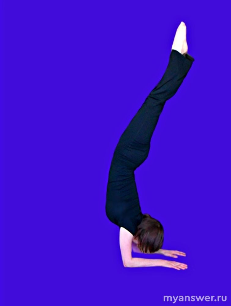 Поза 2: Пинча Майюрасана (поза Пера Павлина) В этой позе ноги рывком поднимаются вверх с опорой на ладони и предплечья. При освоении этой стойки у стены главное - это попытаться сначала просто ненадолго удержать равновесие, слегка оттолкнувшись ногами от стены.