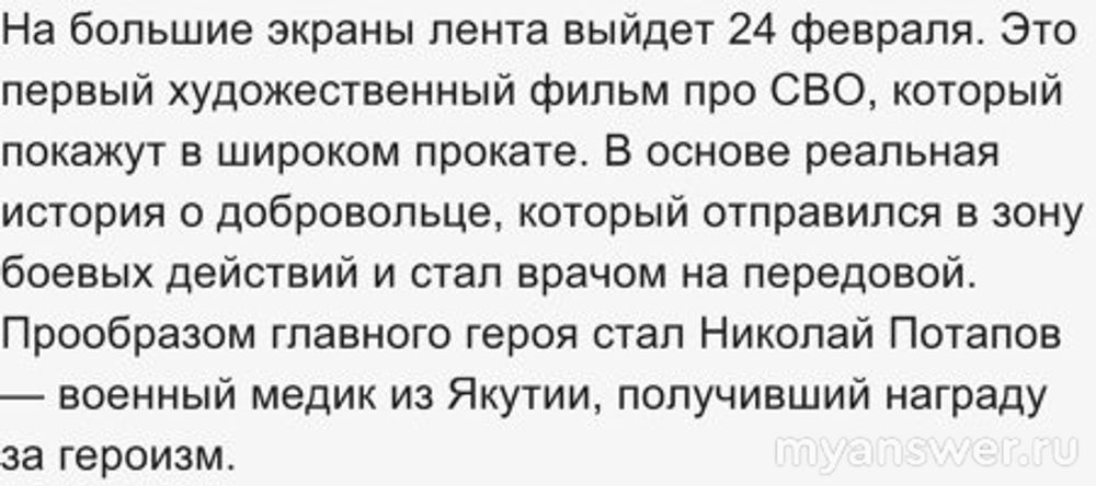 Предпремьерный показ в Москве уже состоялся в декабре 2024-го года. А на большие экраны он выйдет в день начала СВО - 24-го февраля 2025-го года. Вот что известно из "Российской газеты" -