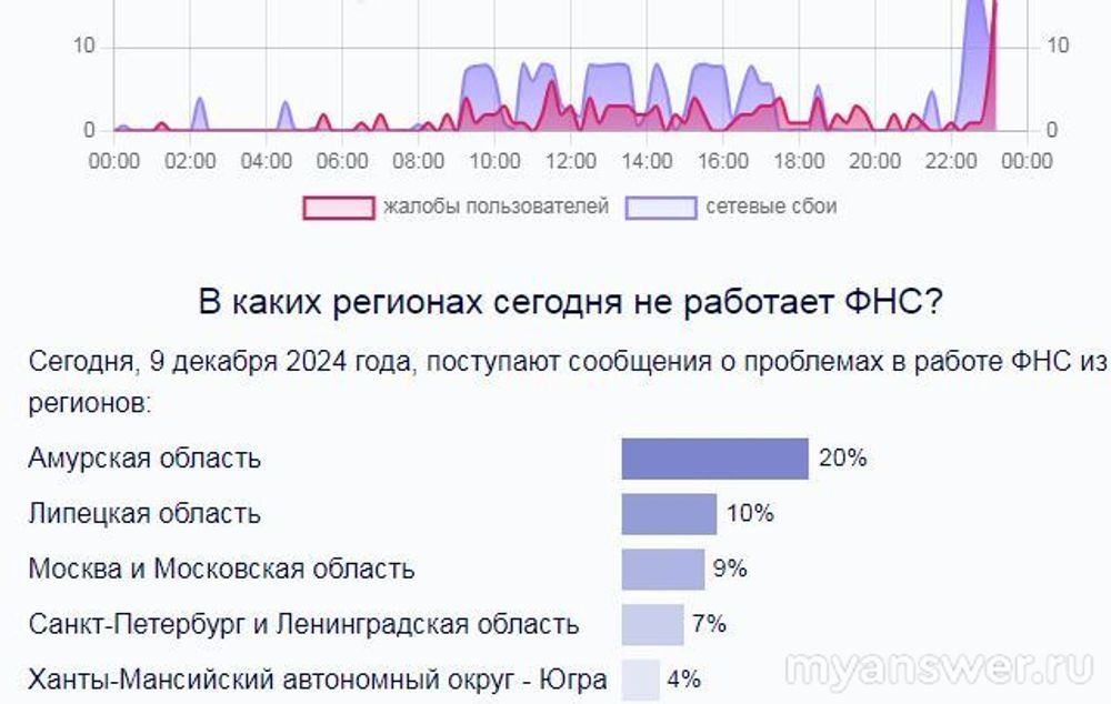 Мониторинг ситуации показывает, что столкнулись со сбоев в работе ФНС жители разных регионов 10.12.2024 года. По статистике, жалобы зафиксированы из Амурской области, Ярославской области, Липецкой области, Москвы, Санкт-Петербурга, Ленинградской области и Московской области.