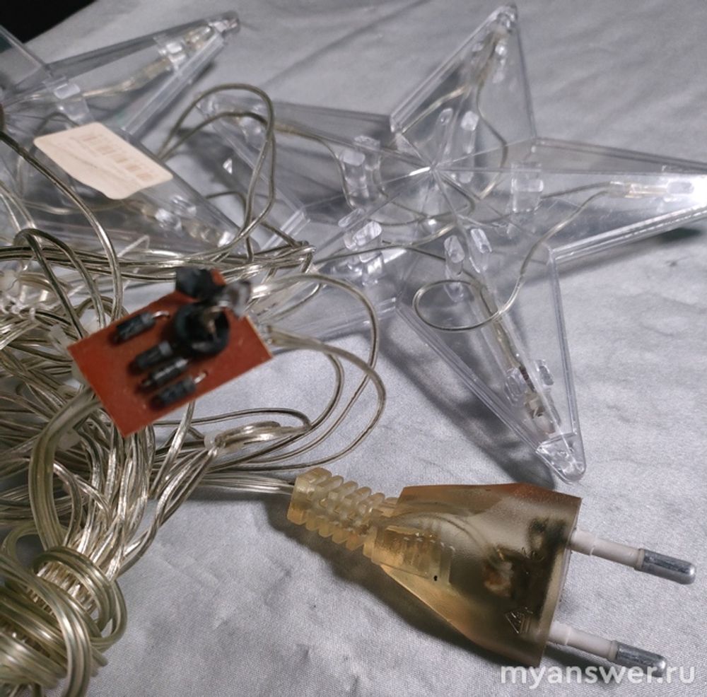 Сгорела гирлянда. После хлопка, корпус конденсатора отлетел и в дальнейшем затерялся. Схема гирлянды очень простая: диодный мост и конденсатор. Правда, есть подозрение, что в прозрачную вилку встроена ещё какая-то деталь. И непонятно она почернела, потому что эта деталь сгорела или почернение результат искрения вилки в розетке.