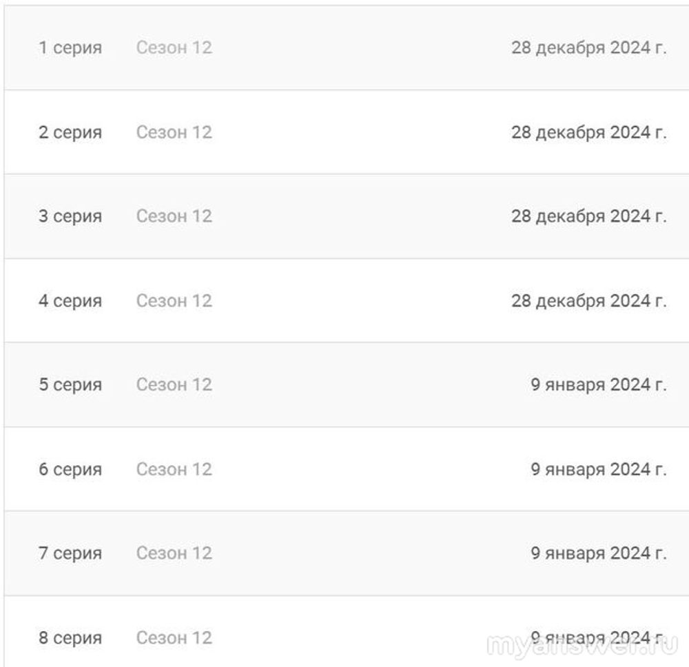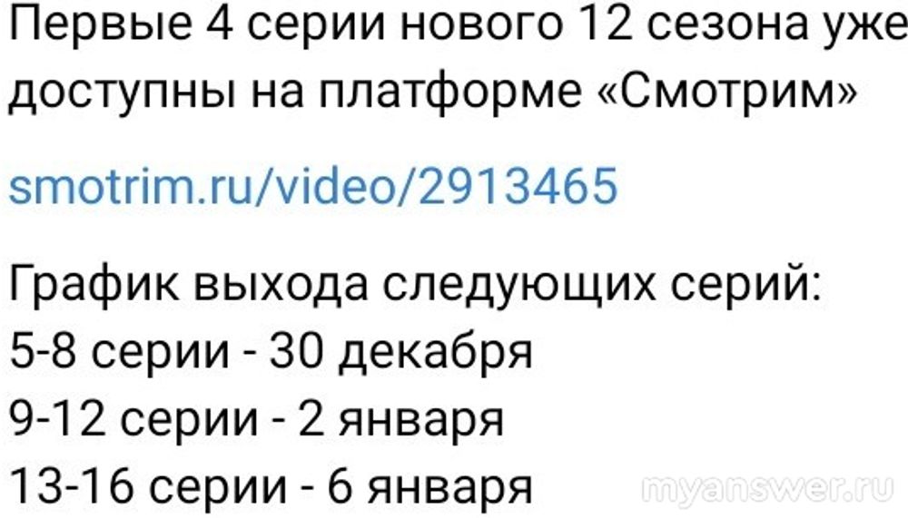 Продолжение уже вышло для тех, кто подписан на платформу"Смотрим", а 3 февраля 2025 года уже все счастливые обладатели телевизоров смогут увидеть 1 серию 12 сезона на канале Россия-1.