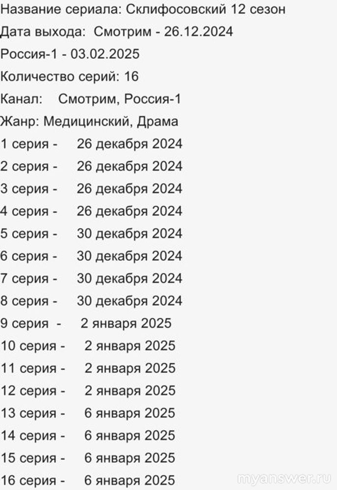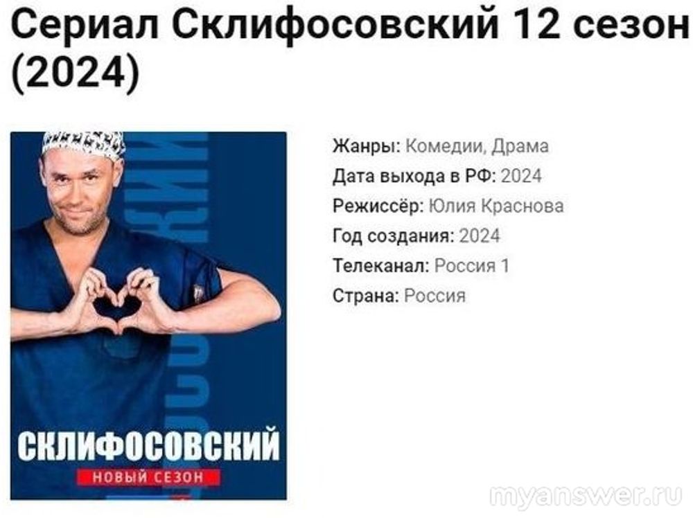 Но потом, по каким-то причинам, премьеру 12 сезона сериала "Склифосовский" сдвинули ближе к Новому 2025 году, и состоялась она в конце декабря 2024 - начале января 2025 года :