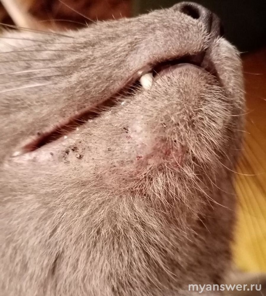 У меня три кота. У одного давно стала замечать чёрные крупинки в шерсти на подбородке, думала, что он просто плохо умывается, он староват и ленив. Но у него так и остаются просто крупинки, сильного воспаления нет. А сегодня у двоих других котов обнаружила тоже такие чёрные точки, крупинки, болячки, да ещё и с воспалением и покраснением:
