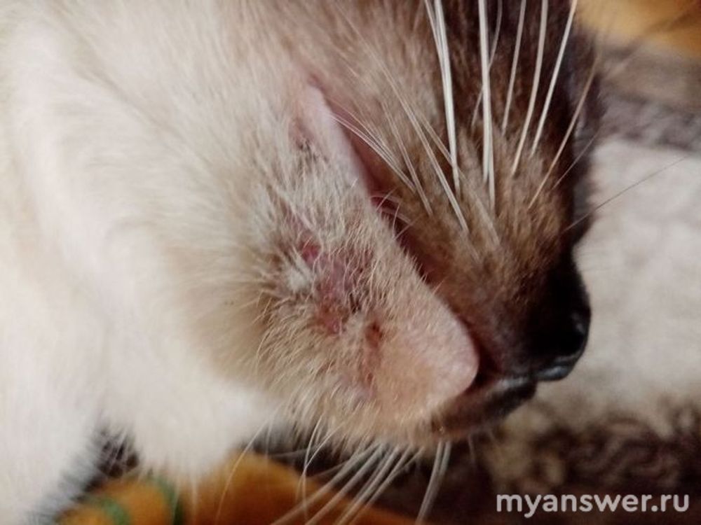 У меня кот и кошка 17 и 9 лет. Дома, а мы живем с начала октября и по конец апреля в квартире, ничего подобного я не наблюдала у своих питомцев. А вот в летнее время с конца апреля по начала октября мои кошки живут на даче и имеют свободный выгул почти весь день. Кот уже не молодой, предпочитает поспать на кровати, выходя ненадолго в сад, бережет себя, так сказать, он ничем не болеет обычно, а вот кошка целыми днями гоняет по саду, естественно, то клеща подцепит, то травму какую получит, то ей уши и нос искусают комары, то начинается воспаление на подбородке, как у вас на фото.