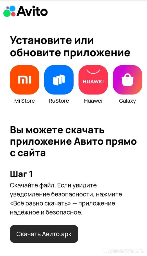 При этом предлагаются варианты: установить файл apk со ссылки, предлагаемой в приложении, или зайти в официальные магазины приложений и скачать Авито оттуда.