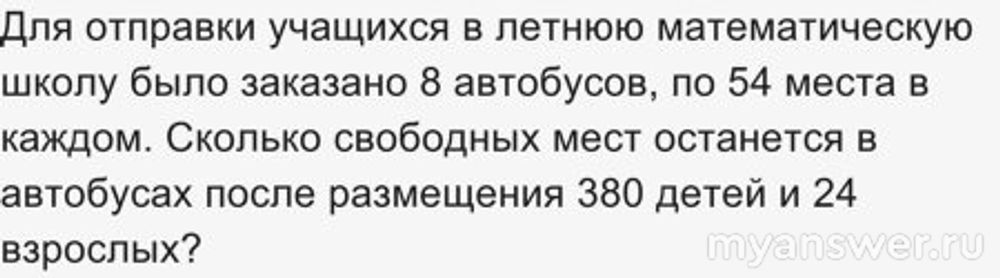 Для отправки учащихся в летнюю математическую школу было заказано 8 автобусов, по 54 места в каждом. Сколько свободных мест останется в автобусах после размещения 380 детей и 24 взрослых?