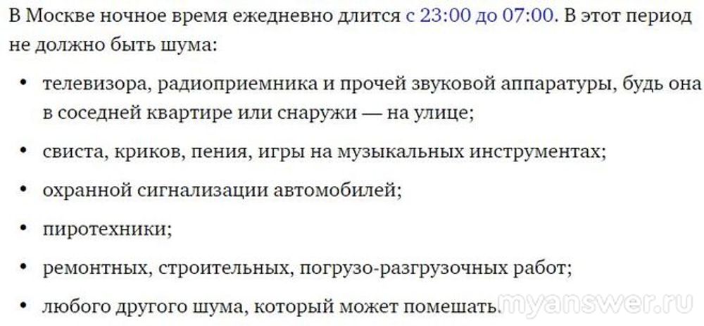 Ночное время - это со скольки до скольки? Если Москву брать, то тут так будет - в 11 вечера (23:00) начинается старт отсчета ночного времени, которое длится восемь часов, то есть до 7 утра (7:00). Предел по децибелам тоже установлен, он не должен превышать такое предельное значение, как 45 дБ. Это как? Если разговор идет в обычном тоне между людьми (взрослыми) то тут уже есть превышение, поскольку в среднем там 50 дБ. Вот перечень, что нельзя в ночное время в Москве: