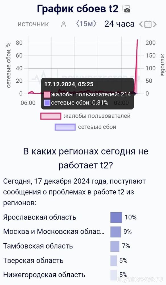 Еще днем накануне у оператора t2 начались небольшие волнерия в работе системы, которые ему, как правило, не свойственны. И уже 17 декабря 2024 года около первого часа ночи по мск случился резкий рост жалоб.
