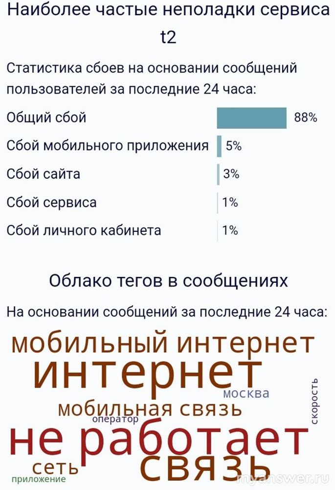 Текущее состояние сервиса TELE2 показывает, что общий сбой в его работе по статистике составляет девяносто процентов, остальное распределение зафиксировано 17.12.2024 года такое: