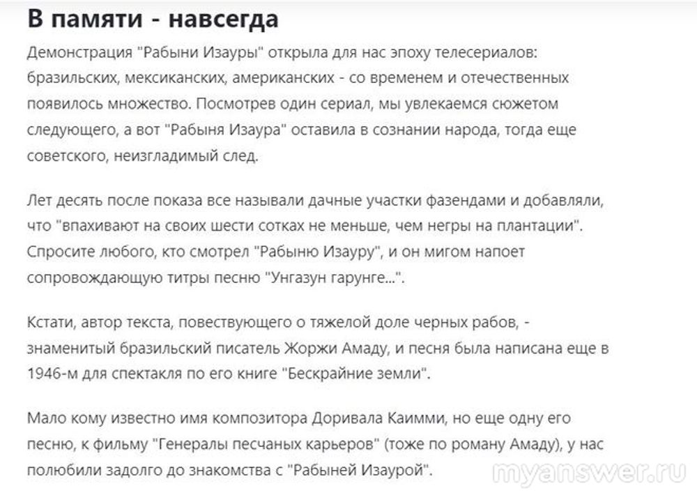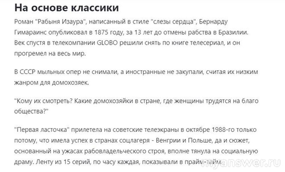 Насколько я помню самым первым сериалом из Латинской Америки на наших телеэкранах был бразильский сериал "Рабыня Изаура". Это было в октябре 1988 года и говорят, что когда показывали очередную серию улицы пустели. Потом уже стали появляться мексиканские и даже американские сериалы, ставшие весьма популярными. Сейчас в Дзене я усматриваю некоторую ностальгию по этим сериалам, вспоминаются актрисы типа Виктории Руффо и другие. Как бы кому нравились или не нравились эти сериалы, но они реально были Явлением и уж точно не демонстрировали нечто негативное как бесконечные драки или стрельбу. Главные роли в сериале "Рабыня Изаура" сыграли Луселия Сантуш и Рубенс де Фалко. Кстати в первом показе было всего то 15 серий, что не дотягивает до теперешних наших стандартных 16 серий. Это уже потом стали появляется по-настоящему "долгоиграющие" сериалы по 100 и более серий. А сначала, до показа в СССР сериал "Рабыня Изаура" показали в Венгрии и в Польше, которые тогда были странами "соцлагеря" и только после такой "апробации" руководители тогдашнего МинКульта дали добро на показ в СССР и они не прогадали как оказалось. Одно слово "фазенда" которое плотно вошло тогда в лексикон советских граждан уже говорит о невероятной популярности "Рабыни Изауры"