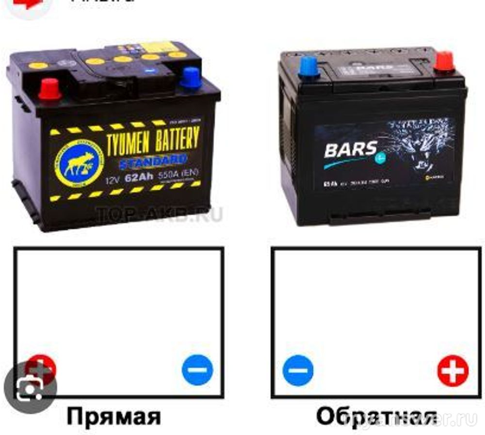 Там, наверху, около клеммы, есть знаки "+" и "-" ("плюс" и "минус", соответственно). Если их не видно, забились грязью, ну можно протереть тряпочкой. Если нет тряпочки, надо послюнявить палец и потереть поверхность аккумулятора около клеммы.