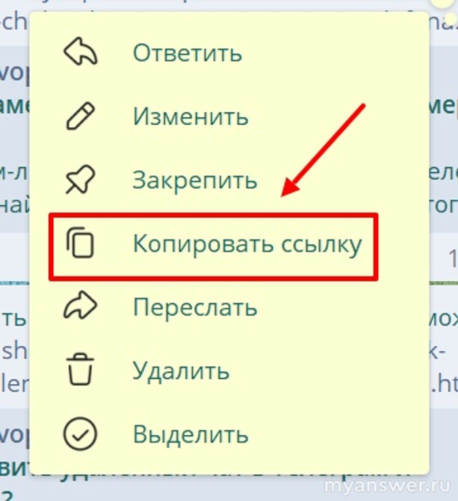Если в опубликованном посте нет ссылки на какой-то интернет ресурс, а есть только написанный текст, то скопировать ссылку на этот пост не получится. А если в тексте поста есть кликабельная ссылка, то ее довольно легко скопировать в буфер обмена. Для этого (в веб-версии Телеграм) наводим курсор на ссылку, затем нажимаем правой кнопкой мышки и в выпадающем окне выбираем опцию "Копировать ссылку". Все теперь ссылка скопирована в буфер обмена и ее можно отправить в любой из выбранных чатов. В мобильной версии все делается примерно так же.