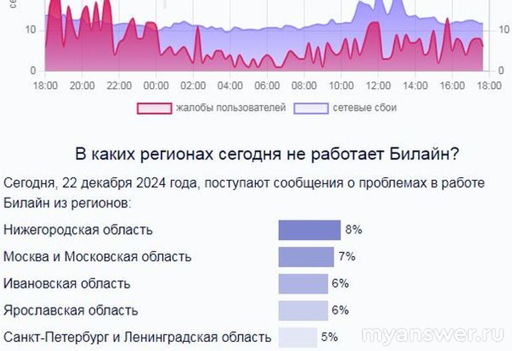 У Билайна 22 декабря проблемы со сбоями идут весь день, начиная с ночи. Жалобы также не кончаются, так как Общий сбой составляет на полдень 95 процентов. Жалуются на нестабильный интернет, плохую связь. Домашний интернет сильно зависает и, следовательно, телевидение не работает. Из разных регионов страны летят жалобы и, значит, это проблемы местного характера, а такой, усиленный сбой во многих регионах. В интернете можно найти только общие ответы на вопросы сбоев. А лучше обращаться прямо в поддержку: