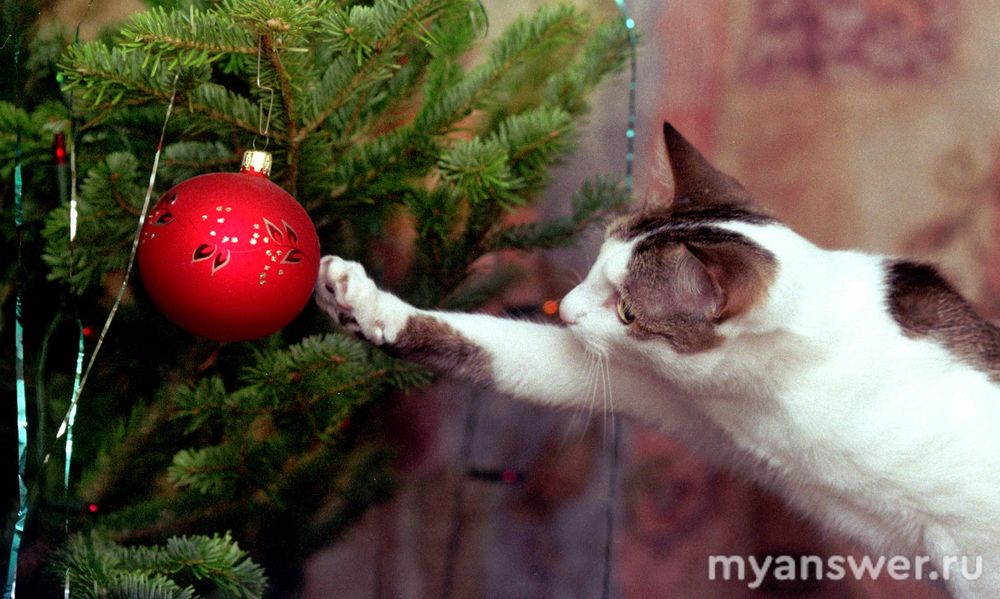 Многие кошки любят новогодние елки. Их привлекают яркие игрушки и новые запахи.