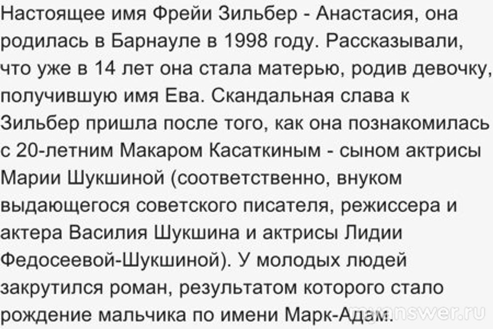 Я сейчас вспомнила тот шум, который поднялся, когда Макар Касаткин разорвал отношения с Фрейей (Анастасией) Зильбер. Тогда писали, что Мария Шукшина настроена против этой девушки из Барнаула. Особенно обострились отношения, когда Фрейя стала появляться в скандальных программах (например, у Андрея Малахова) и "зарабатывать на семье" Шукшиной.