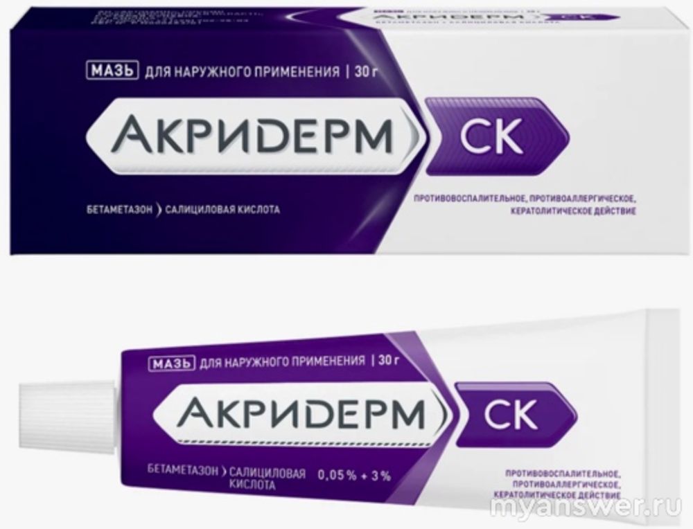 А вот Акридерм это из серии гормональных препаратов, хотя и легких. Он может вызвать побочные реакции. Например на лицо более пяти раз его наносить не рекомендуется.