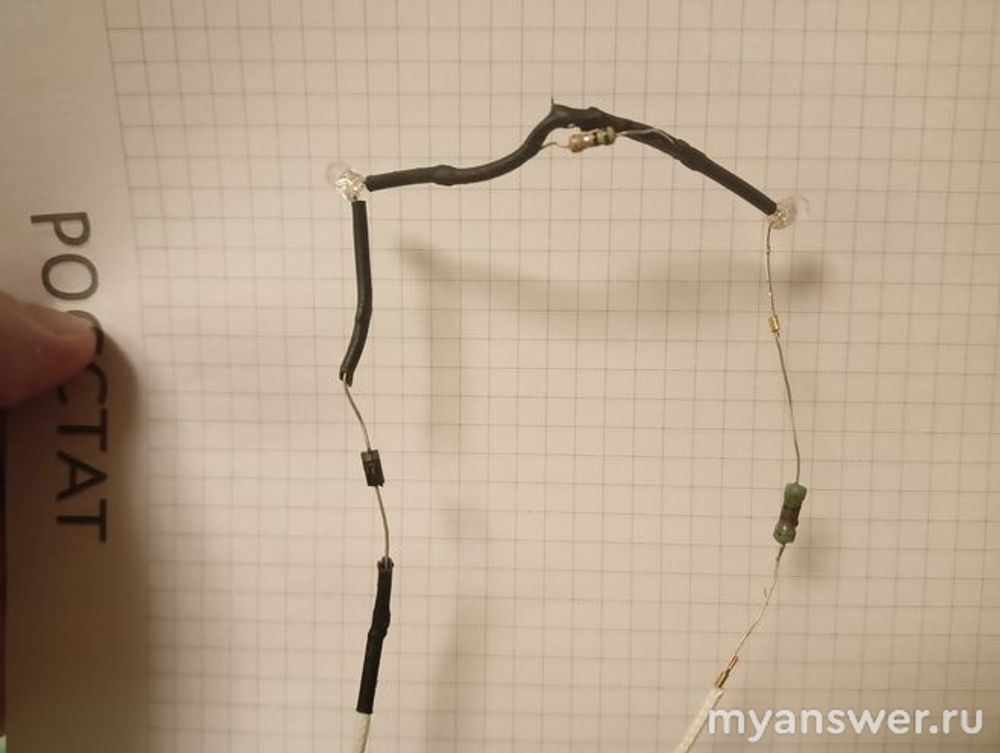 2.состоит из двух резисторов, двух светодиодов и диода. Схему приложу, извините за ее качество заранее)