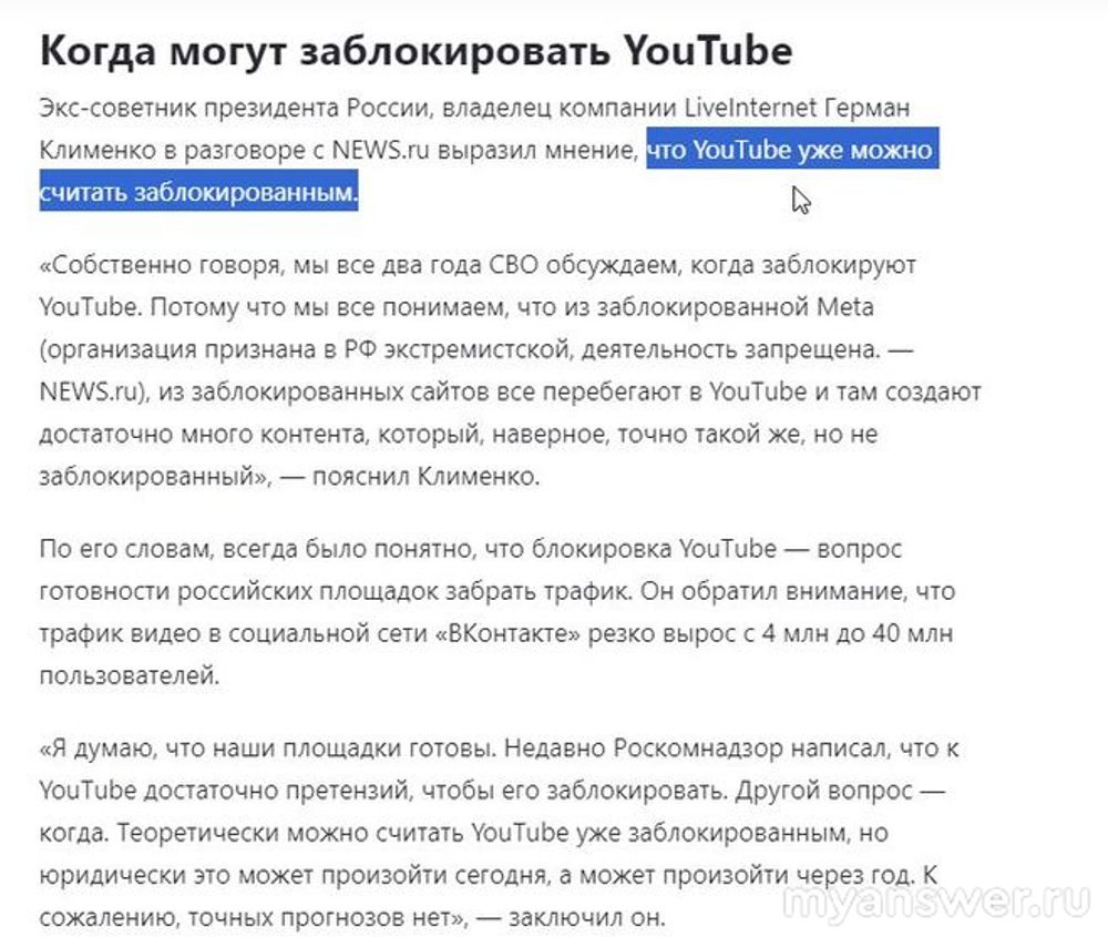Сколько интересной и полезной информации есть в Ютубе и в том числе опубликованной нашими российскими пользователями, что будет весьма печально расставаться с этим ресурсом. Когда пропал у нас Мета (фэйсбук) я погоревал недельку другую, а сейчас в два клика могу туда зайти, но делаю это раз в неделю или того реже. На Ютубе я заливал много своего авторского видео лишь изредка дублируя на Рутуб. Так что, жалко будет если Ютуба у нас не станет. Что касается "неуважения к России" Ютубом, то и без Ютуба полно негатива во всех смыслах. Логически вытекает, что если отрубят нам Ютуб, то следующим шагом будет и вовсе отключить интернет. Ведь все знают поговорку "свинья везде грязь найдёт". Кстати, я на Ютубе давно смотрю ролики из Беларуси, где автор выкладывает видео о том, как он строит свой хуторок в лесу и к нему прибился кабанёнок, который уже стал большим настоящим Кабаном и живёт на его участке, но они вместе ходят за несколько километров к его строениям в лесу, так вот это кабан летом первым делом ищет лужу и в ней валяется, это чтобы не донимали насекомые. Это про грязь и свиней. Ещё недавно я был оптимистом в отношении работы Ютуб в России, но настолько низкий трафик какой у нас сегодня склоняет к пессимизму в этом вопросе. А ещё эта фраза в комментарии "неуважение к нашим гражданам". Ну право же, в Сети столько всего "неуважительного" даже на обычных форумах не имеющих отношение к политике, что модераторы не справляются. Для нас в России Новый Год это праздник и будем ждать что будет на сам Новый Год или сразу после. Дат полной блокировки называлось много. А ещё меня улыбнуло, что якобы трафик ВК-видео сильно вырос. Я же смотрю московских стримеров и их каналы еле дышат на ВК. И фраза Германа Клименко мне не понравилась (на втором скриншоте)