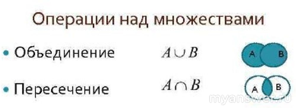 Вначале вспомним правила. Что такое объединение и пересечение множеств. Это показано на картинке ниже.