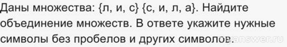 Даны множества: {л, и, с} {с, и, л, а}. Найдите объединение множеств. В ответе укажите нужные символы без пробелов и других символов.