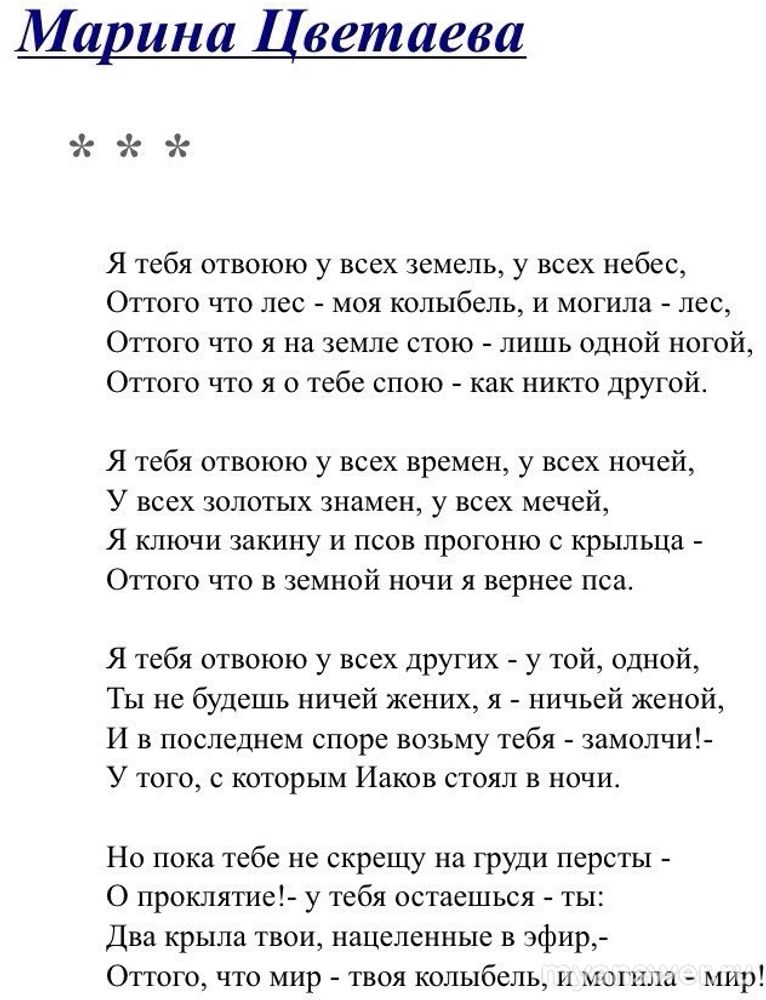 «Я тебя отвоюю» - это довольно старая уже песня композитора Игоря Крутого на слова Марины Цветаевой. Песня написана в 1994 году. А само стихотворение написано в 1916 году. Первой исполнительницей песни была Ирина Аллегрова. Сейчас эта композиция вновь стала популярной после того как ее исполнил Дима Билан, до него пели Шура и Дубцова. Великие стихи, хорошая музыка - что же не петь то)