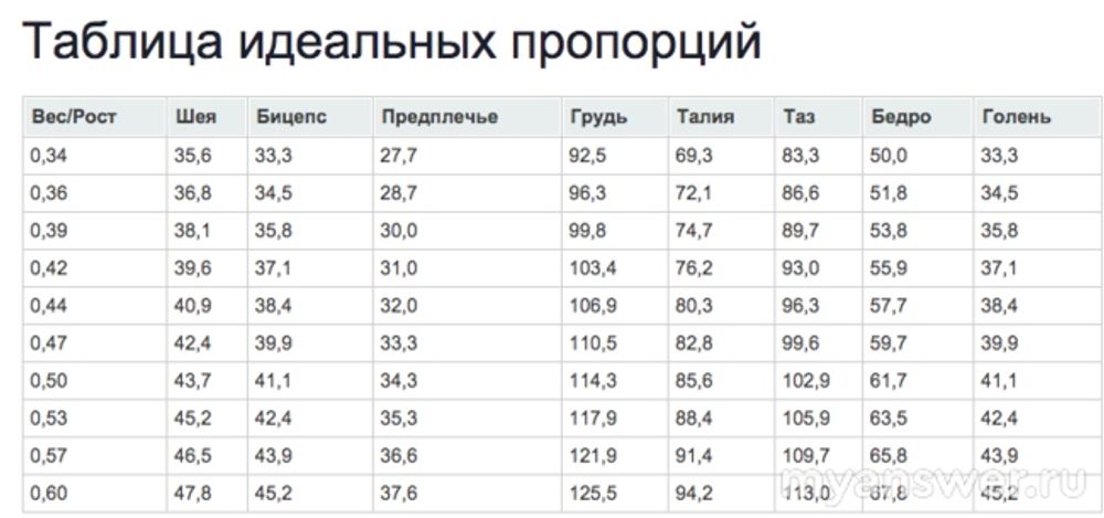Раз так конкретно, то лучше воспользоваться этой таблицей, потому что еще нужен вес. Вес делите на рост, получаете правильное соотношение. Здесь дается полная окружность той или иной части тела.