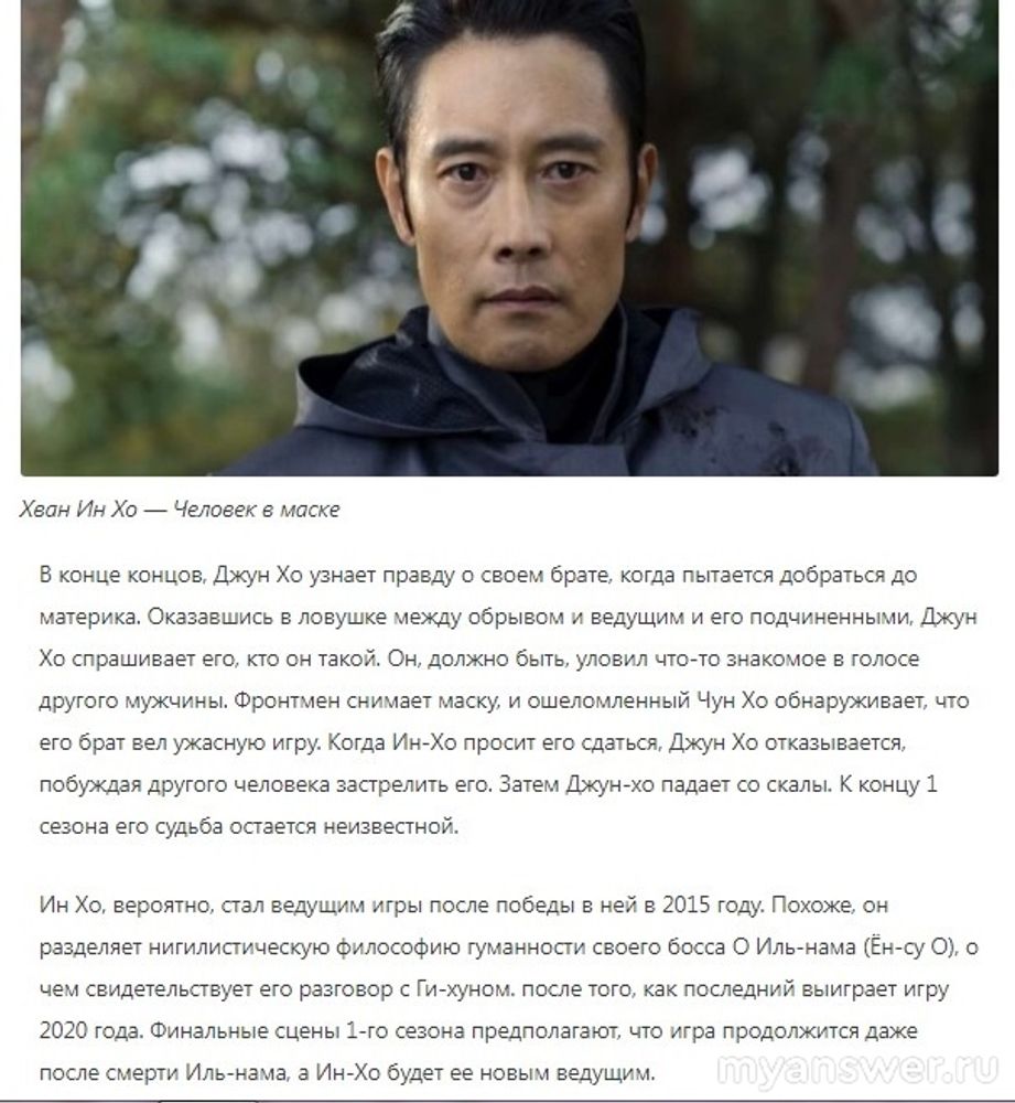 Мы с мужем данный сериал смотрели, когда первый сезон показывали. Мне лично понравилось. Не зря, столько людей у экранов залипали. Игра, конечно, это страшная. Я бы в такую играть не согласилась. Мы с замиранием сердца смотрели и думали, что это за игрок ноль ноль один. Потом узнали, что это дедок был О Иль Нам. Разумеется, второй сезон мы тоже смотрели, поскольку первый нам сильно понравился. Там тоже был новый игрок под номером ноль ноль один. Мы снова гадали, кто же это может быть. Потом уже мы узнали, что им является человек в черной маске. Он является помощником деда из первого сезона. Звать его Хван Ин Хо, он же организатор данной игры.
