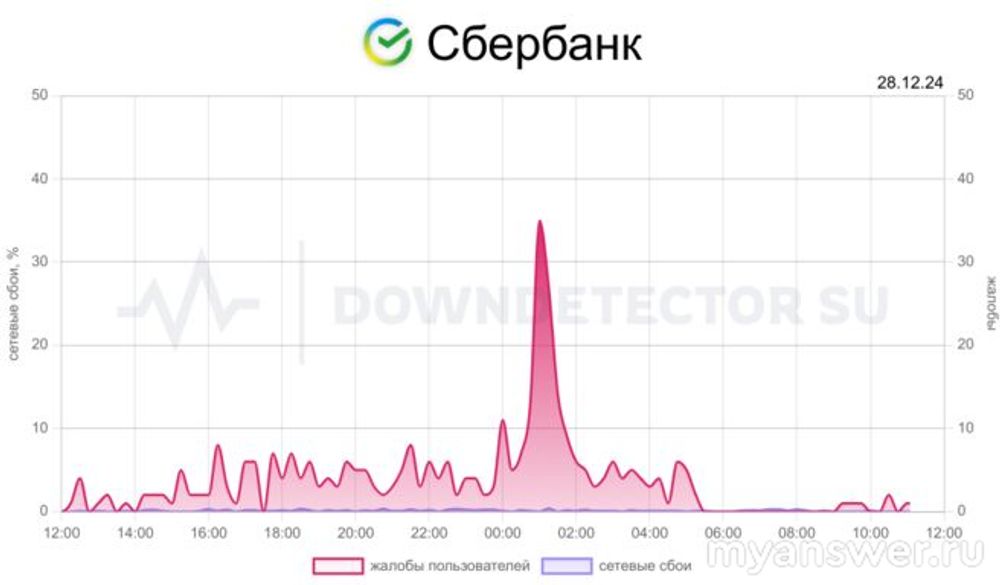 На 28 декабря 2024 года мой Сбербанк Онлайн работает исправно и мне грех на него жаловаться, хотя в графике сбоев по вышеназванному приложению хорошо видна нестабильность его работы с резким скачком несколько часов назад, хотя уже на данное время работа у Сбербанк Онлайн восстановлена и связано это скорее всего с небольшими проблемами с оборудованием Сбербанка.