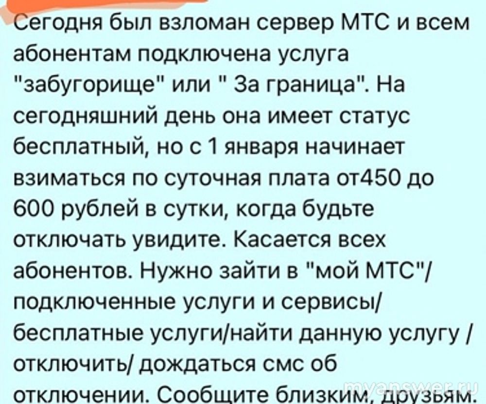 Как найти подключенные платные услуги МТС и как отключить Забугорище (490 р в день) таким был вопрос, отвечаю. Через мессенджер я был предупрежден, что абонентам МТС 26 -27 декабря подключили услугу Забугорище, которая является платной от 490 р. в день. Чтобы проверить так ли это, я вошел в личный кабинет и попытался найти эту услугу. На главной странице ее не было, в подключенных платных услугах тоже нет. Нашлась услуга среди бесплатных услуг, там кстати было написано что услуга "закрыта для подключения". Оказывается такая услуга входит в некоторые старые пакеты на МТС, и действительно, как написано, эти деньги списываются только при нахождении за границей. Информацию о том, что данная услуга будет активирована с 1 января 2025 года, корпорация мобильные телесистемы опровергла. Да и как иначе, ведь признай они ее, пришлось признавать и факт подключения платных услуг без ведома заказчика. Чтобы не испортить себе репутацию МТС отрицает данное сообщение. Я отключил услугу из приложения. Если приложения у вас нет, позвоните оператору.