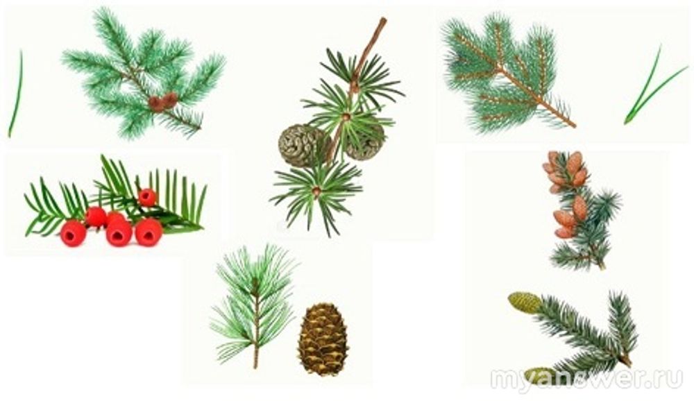 – Мне кажется, нас где‑то обманули, – прищурился Витя, расправляя веточки новогодней красавицы. – Ёлка, может, и искусственная, но веточки и хвоинки всё равно должны иметь биологически правдоподобную форму! Установите соответствие между хвойным растением и характерным для него строением и расположением хвоинок.
