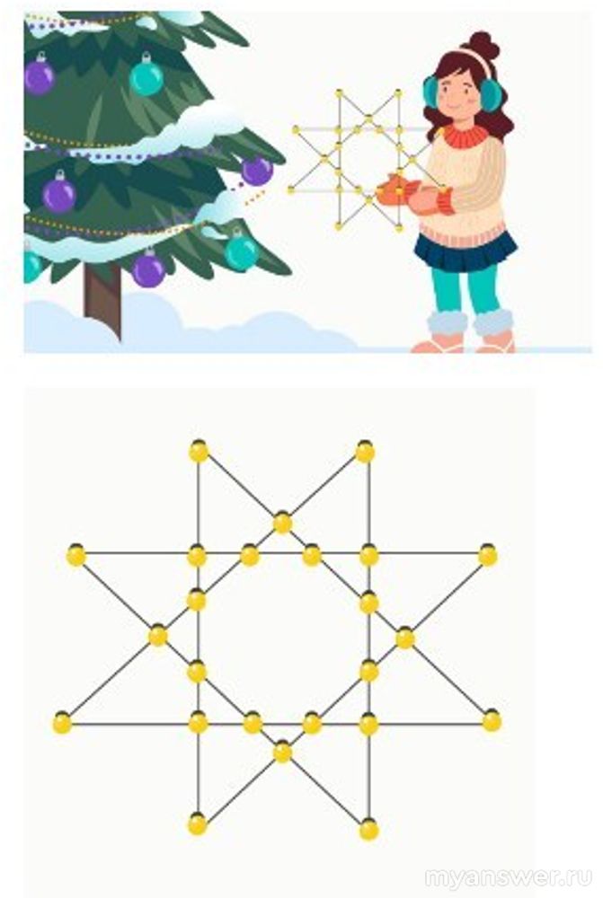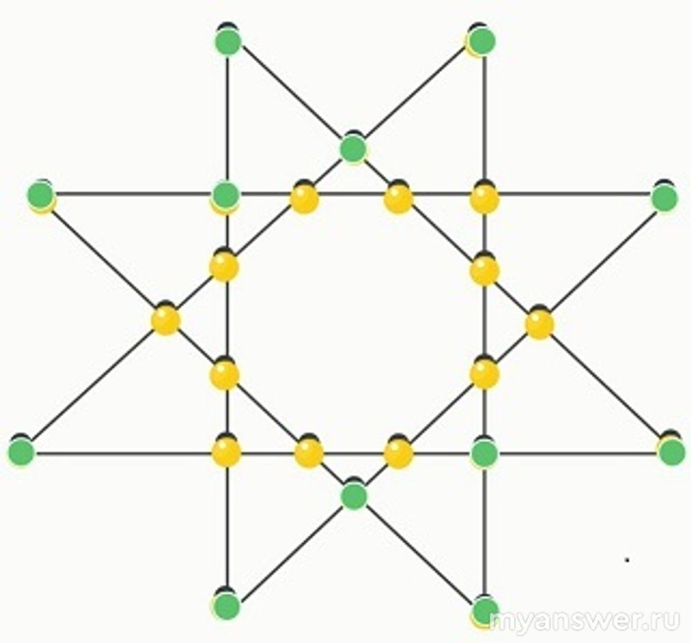 Всем хороша была ёлочка, но чего‑то ей не хватало. Поразмыслив, Маша принесла с чердака игрушку в форме восьмиконечной звезды. В точки пересечения рёбер можно ставить диодные лампочки. Игрушка засверкает всеми красками, если замкнуть электрическую цепь: для этого нужно вставить диоды так, чтобы на каждом ребре их оказалось хотя бы три. Разместите лампочки так, чтобы звезда засияла. Имейте в виду, что в прошлом году Витя использовал диоды в своей гирлянде и тех осталось мало, поэтому чем меньше лампочек вы используете, тем больше баллов получите.