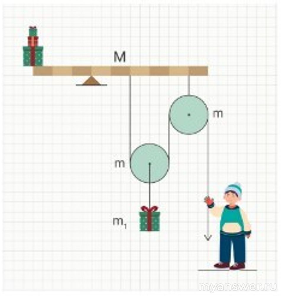 Пока Дед Мороз подгонял сани для погрузки, Вите пришлось залезть в подвал и удерживать конструкцию с подарками для Уточкино (вот такие они, сказочные технологии). Конструкция состоит из однородной доски массой M=1 кг, двух блоков по m=0.6 кг каждый и верёвки, которую можно считать невесомой и нерастяжимой.