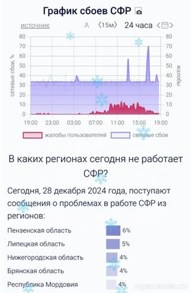 Сегодня 28 декабря 2024г. по жалобам пользователей не работает сайт СФР, пользователи не могут зайти в личный кабинет, у некоторых недоступен сайт уже с утра (Пензенской обл., Липецкой обл., Нижегородской обл и др).