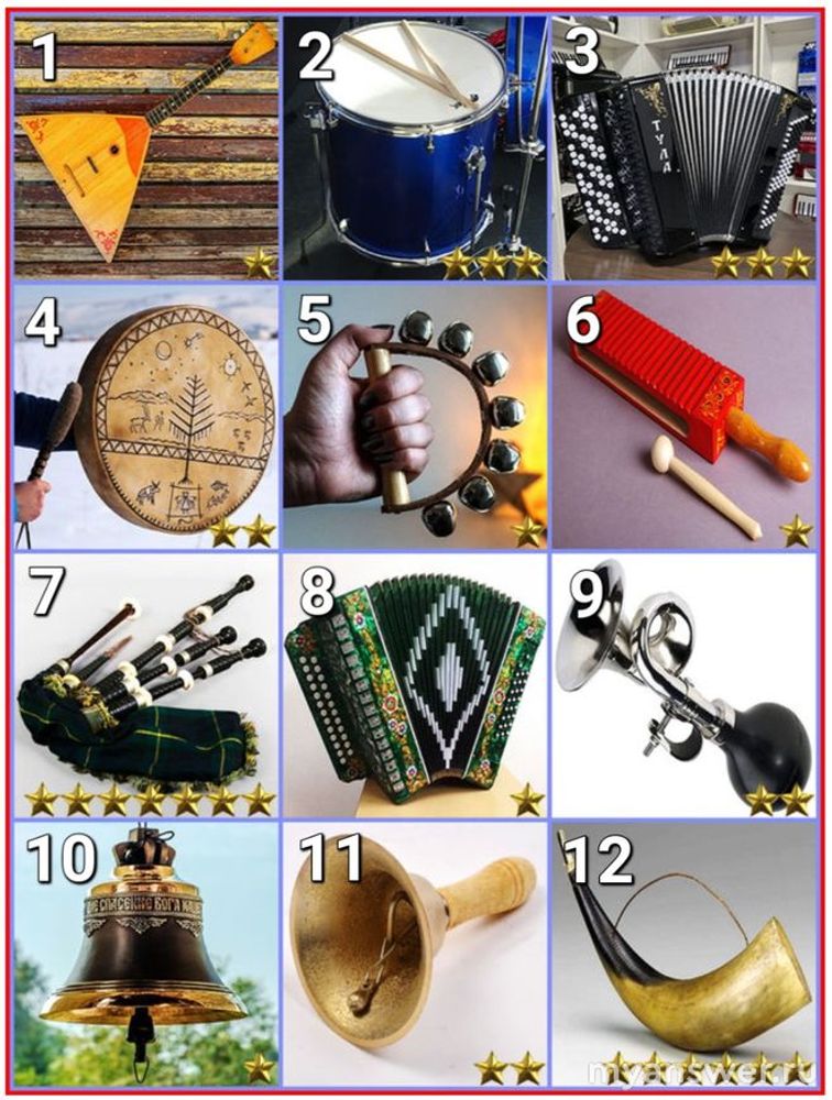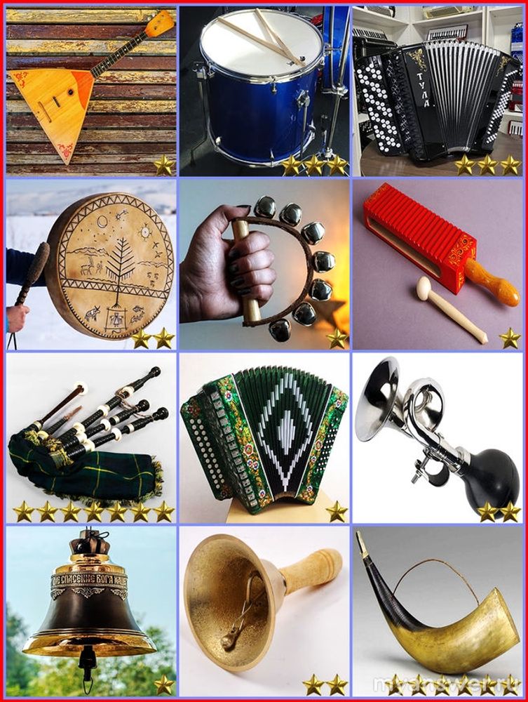 Объединить все остальные музыкальные инструменты может слово звук. Гусли, барабан, аккордеон, бубен, трещотка, волынка, баян и колокольчики имеют звезды по силе звучания, высоте звука.