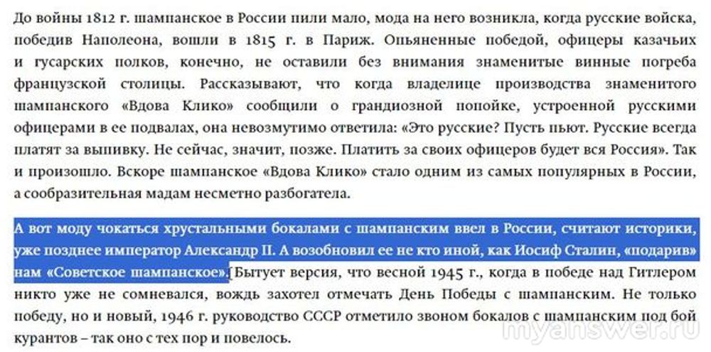 Логично было бы предположить что ввёл моду на испитие на Новый Год Шампанского царь Пётр 1-й, который вообще много чего ввёл. Но повелевая праздновать Новый Год 1 января ещё шампанское не имелось ввиду. Кстати, в то время упор делался не на столы, а на Балы. А ещё во время правления Петра 1-го не было такой тесной связи России с Францией. Ну и ещё- в России в то время жили в основном крестьяне, которые просто не могли себе позволить пить шампанское. А вот после войны 1812 года связь с Францией стала очевидной, русские квартировались и в Париже в том числе, где из-за них и появилось название "Бистро" (быстро-быстро говорили наши солдаты в тавернах). Ещё интересный факт, французы надеялись на Победу и привезли с собой много бочек с шампанским, чтобы на русской земле отпраздновать Победу, но случилось так, что эти бочки достались русским солдатам и они, испробовав сей "невиданный" напиток оценили его по достоинству, и отпраздновали свою Победу (историческая казуистика). Итак Нейро выдаёт ответ- Александр 2-й. Разумеется, именно при этом царе победили Наполеона. И ещё любопытный факт- через некоторое время возобновил эту традицию уже в СССР Иосиф Сталин, подарив советским гражданам Советское Шампанское.