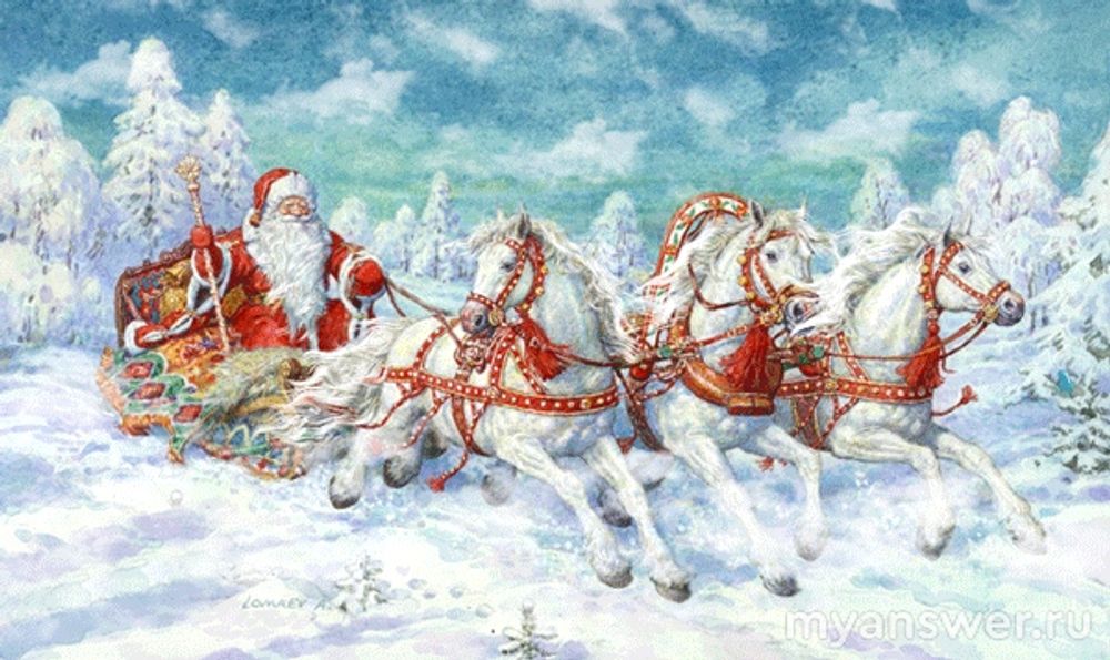 Ну и транспорт - дед Мороз восседает на тройке белых коней, а Санту везёт упряжка оленей.