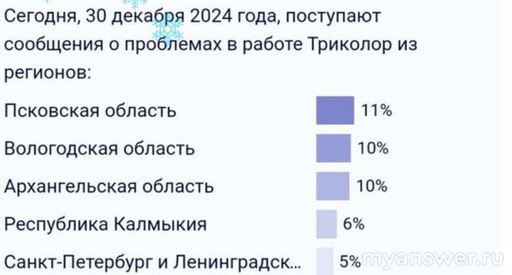 Завтра встречать Новый год, а у некоторых в России накануне праздника вдруг перестал показывать телевизор. Виноват Триколор, не работает он у абонентов этой сети в некоторых областях в центральной России. География неисправности на текущий момент следующая.