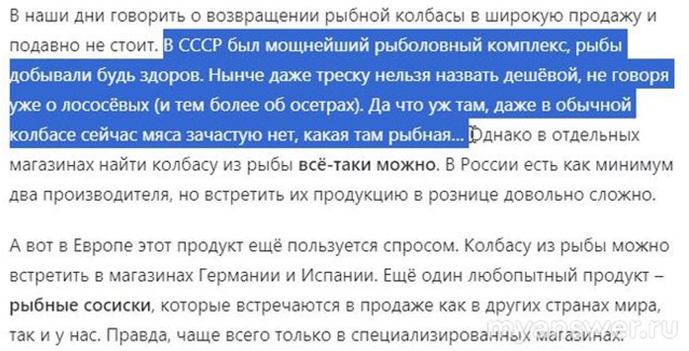 Я за свои шестьдесят с копейками ни разу не видел колбасы из рыбы. Пельмени видел и пробовал во времена СССР. А вот в девяностые, помню вылавливали байкальского омуля тоннами и сбывали на Иркутский мясокомбинат. Там, работяги говорят, валили его в фарши для колбас, для пельменей и везде, где только можно. Ведь байкальский омуль в девяностых ничего не стоил. А теперь не знаю, какую рыбу добавляют в фарши на мясокомбинатах. Только это знаю про рыбную колбасу.