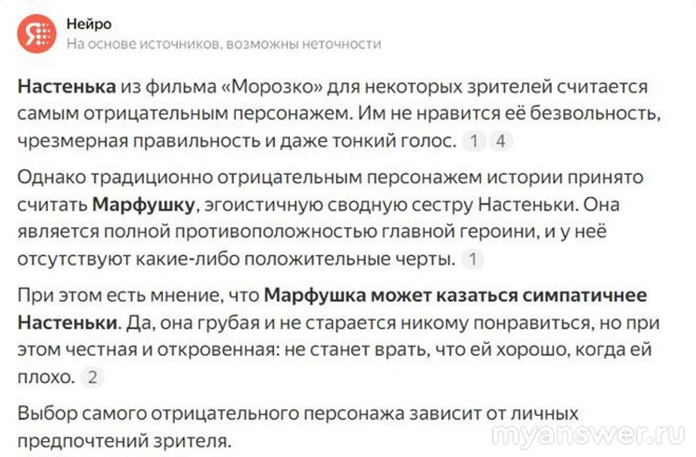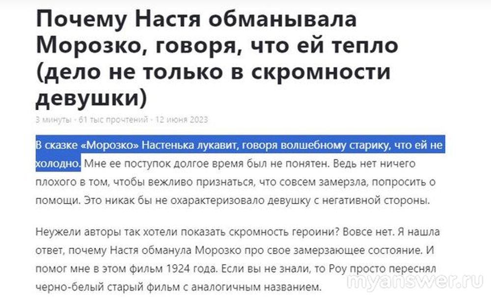 Разумеется речь об экранизации сказки А.Роу. Кстати, фильм вышел на экраны в далёком 1964 году. Сейчас в том же Дзене много довольно интересных статей про старые фильмы и часто бывает так, что авторы этих статей заставляют взглянуть на тот или иной персонаж с необычного ракурса. если можно так сказать. Например, я читал, что Марфушенька-душенька хоть и отрицательный персонаж, но она не лицемерка. говорит что думает. А вот Настенька лицемерка "Не холодно мне, Морозушка". Скажу про себя- для меня ни Марфушенька ни Настенька не являются самыми неприятными.
