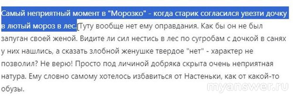 В Настеньке для меня есть что-то приторное, хотя в целом она положительный персонаж. Маменька с Марфушенькой-Душенькой хоть и отрицательные персонажи, но без них сказка была бы не такой интересной. Баба Яга, которую как всегда замечательно сыграл Георгий Милляр, на своём месте и у меня она не вызывает негативных эмоций. А вот Папенька лично для меня и есть самый отрицательный персонаж и не только потому, что он очевидный подкаблучник. Он свою родную кровинушку повёз в лес в мороз, тем самым обрекая на погибель либо от трескучего мороза либо её могли бы растерзать лесные звери. Что может быть хуже? Вот не помню я, Марфушенька-Душенька это его дочь или нет? Кто знает, напишите, пожалуйста, в комментариях или в ответе. И как оказалось, я не одинок в своём мнении: