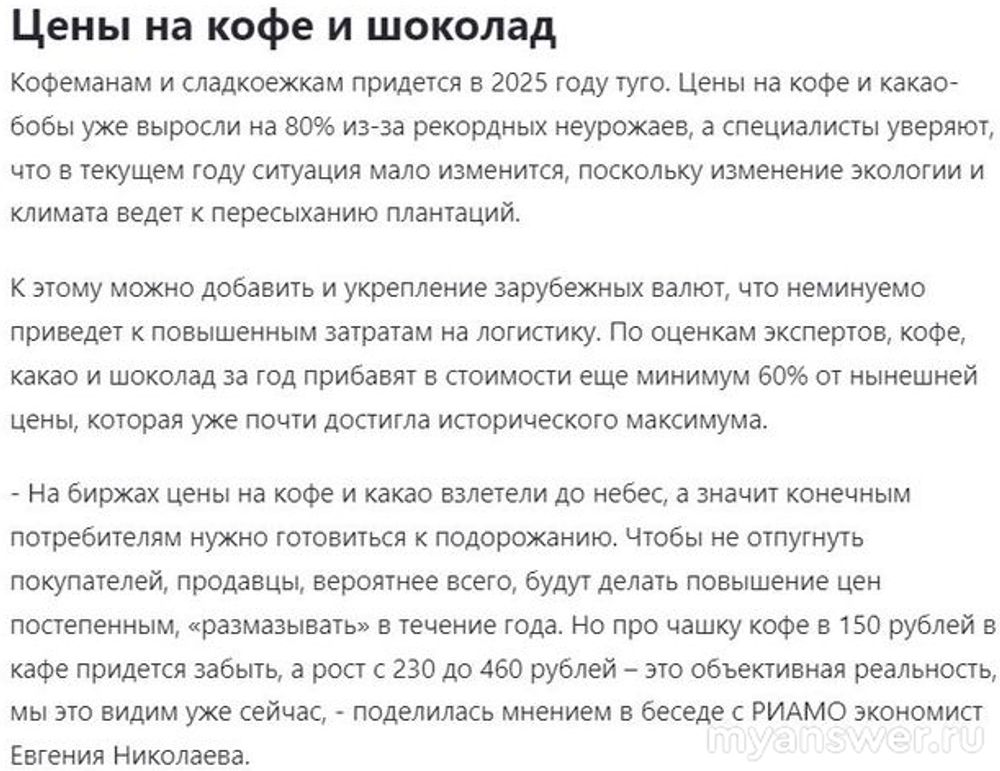 Судя по всему новый 2025 год не станет каким-то особенным в плане цен. Уже начиная с 5 января, когда я впервые после праздника воспользовался доставкой продуктов на дом выяснилось, что практически все продукты подорожали, во всяком случае те, которые я обыкновенно покупаю. Яйца не подорожали, как и сахар-песок, а вот мясо довольно ощутимо подорожало, свиные уши, хвосты говяжьи и пр. Но год только начался, а перспективы не очень радужные.